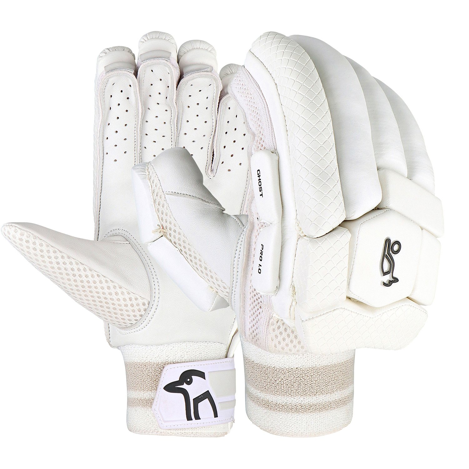 Kookaburra Ghost Pro 1.0 Batting Gloves provide traditional comfort and protection, with HDF backhand padding, sausage styling, and premium detailing for serious play.